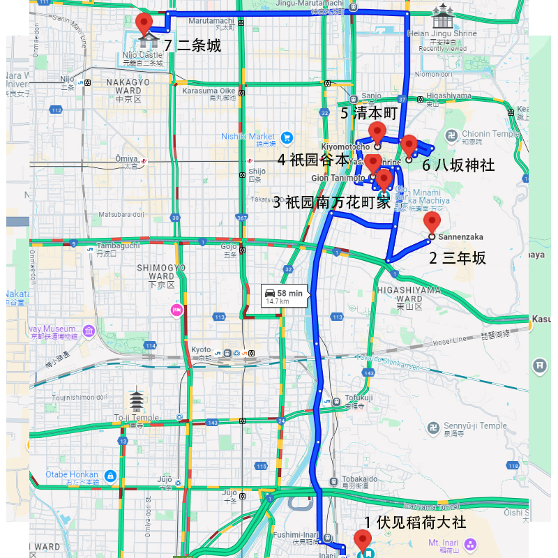 本行程依次游览:伏见稻荷大社 → 三年坂 → 祇园南 万花町家 → 祇园 谷本 → 清本町 → 八坂神社 → 二条城。